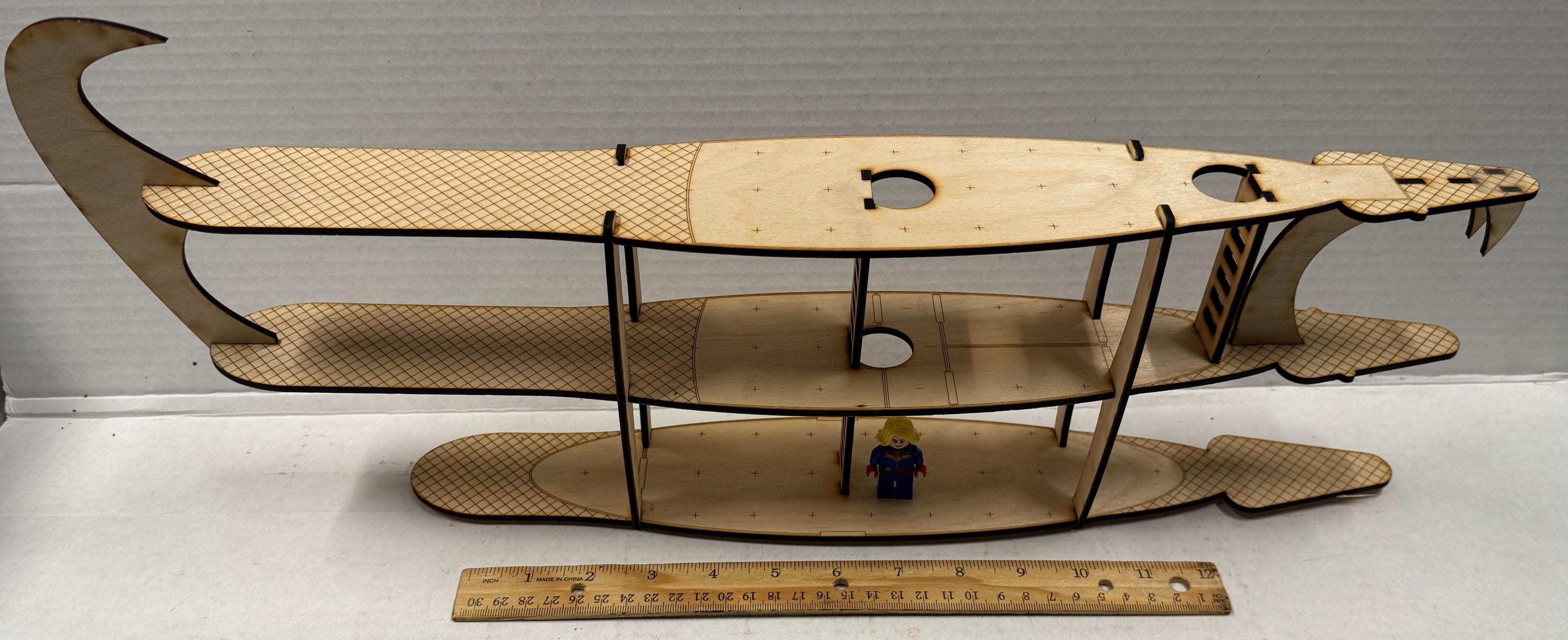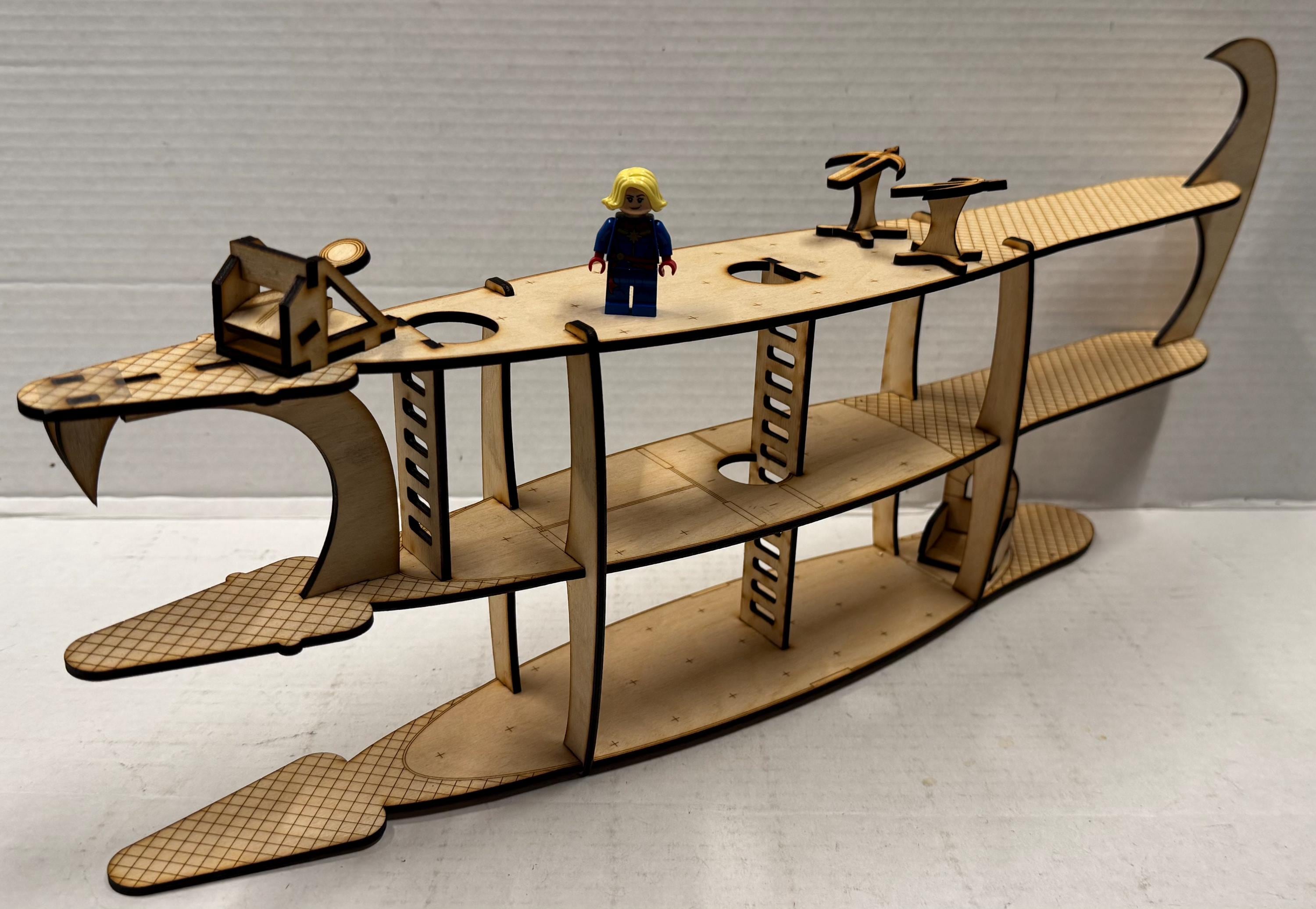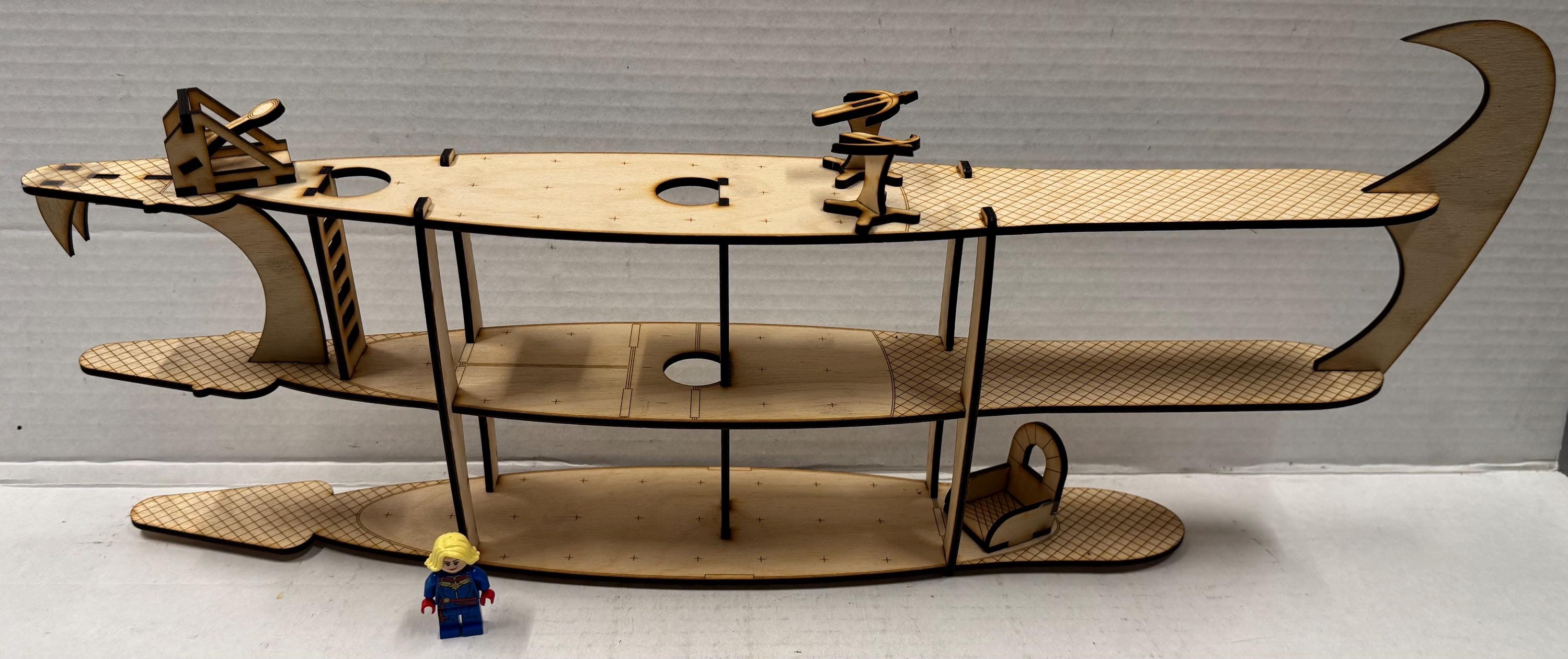 After assembly, this model ship measures 21 inches long overall, 3 inches at the widest point and stands 9 inches to the top of the tail, 6 inches to the top deck. There is a clearance of 3 inches between decks to accommodate various Minis