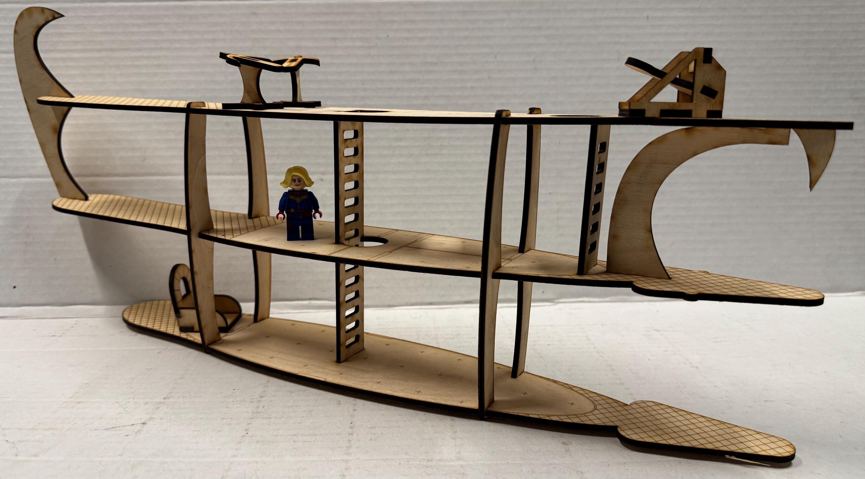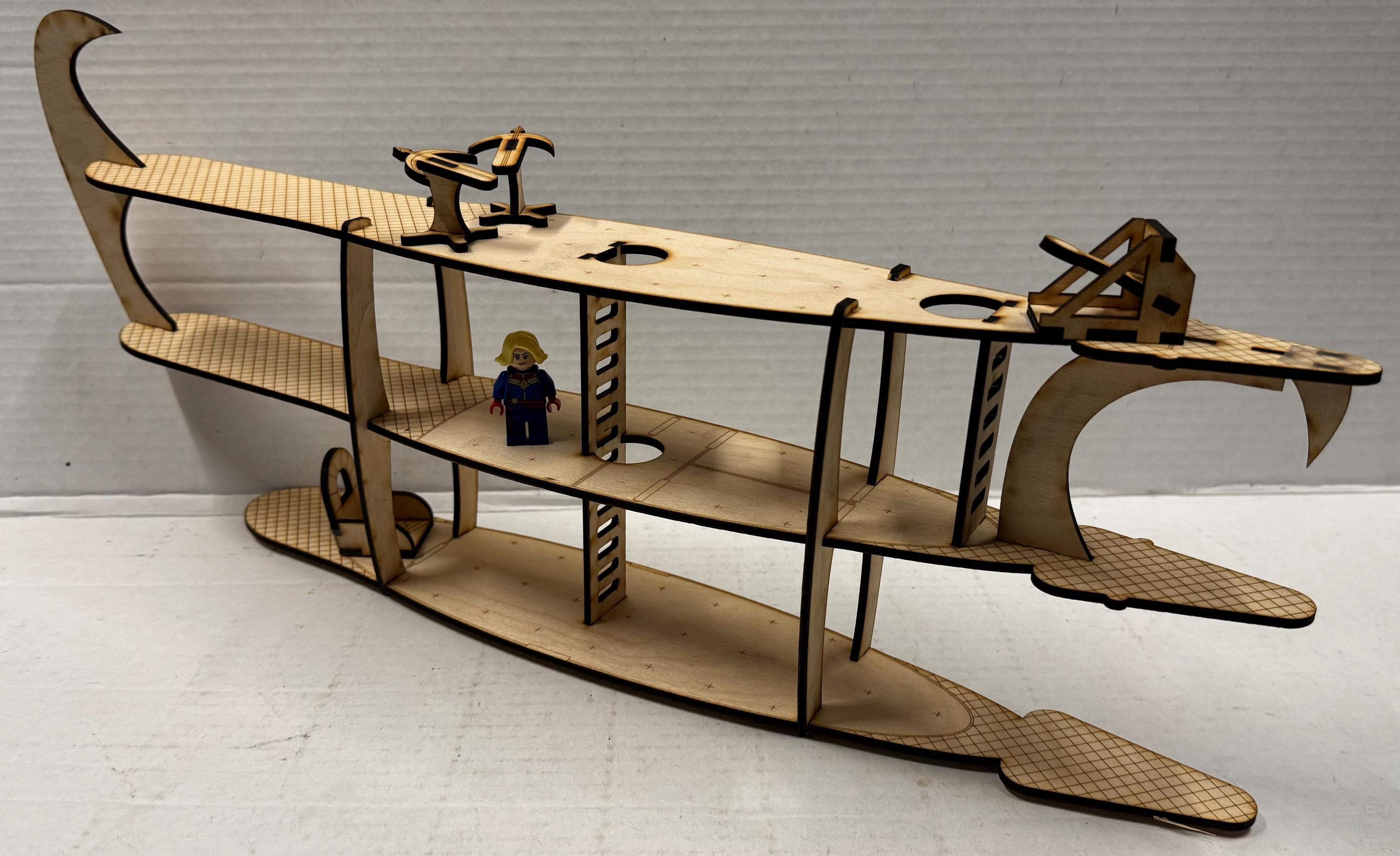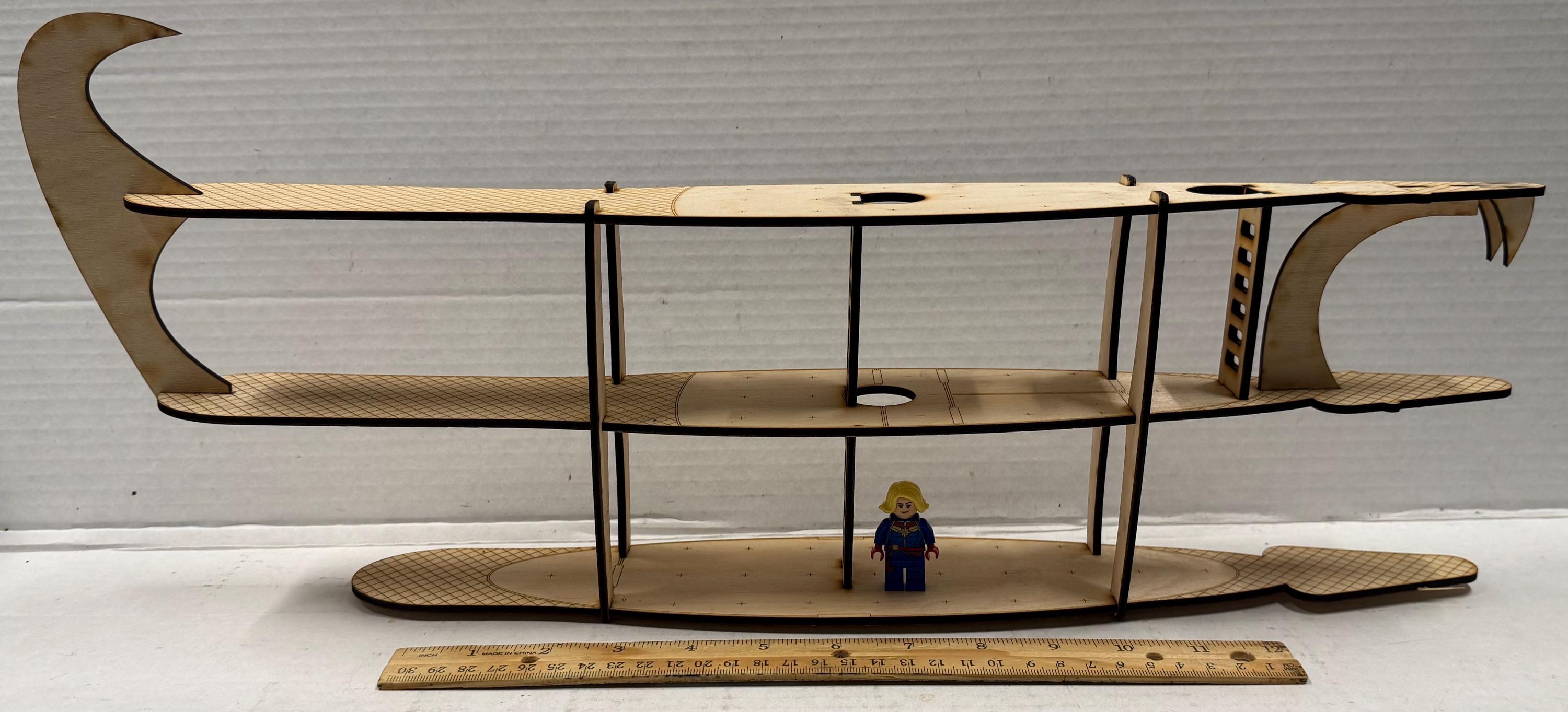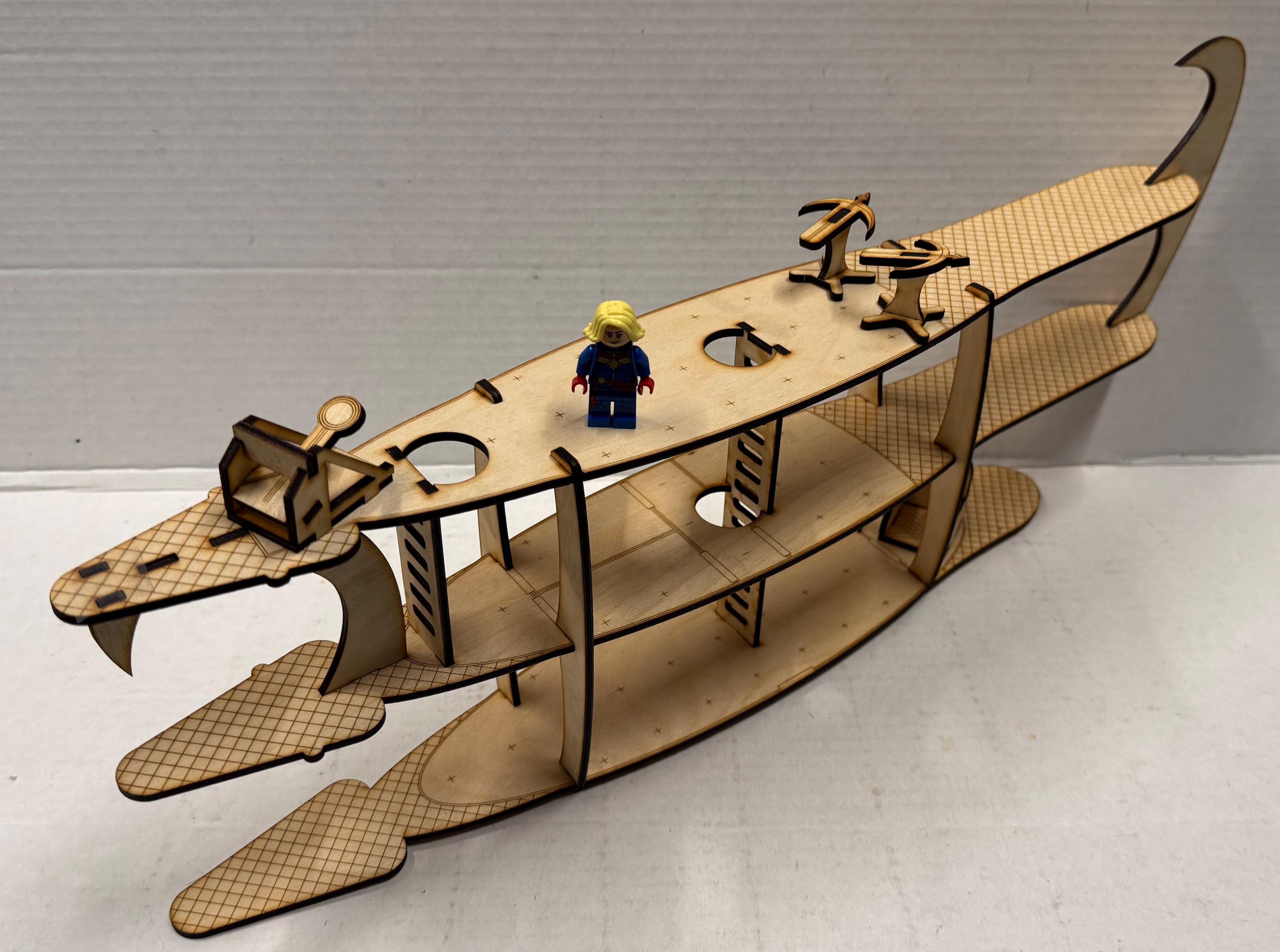 After assembly, this model ship measures 21 inches long overall, 3 inches at the widest point and stands 9 inches to the top of the tail, 6 inches to the top deck. There is a clearance of 3 inches between decks to accommodate various Minis